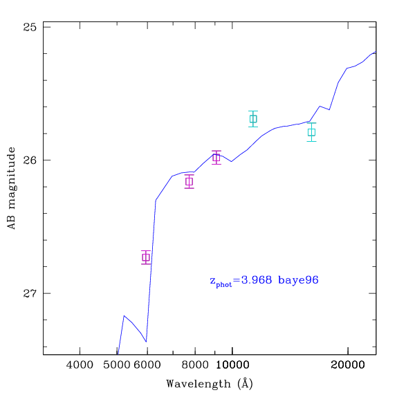 ![]() The figure at right shows the spectral energy distribution of the galaxy in question. It is plotted as AB magnitude vs. wavelength. Note that AB magnitude translates directly into flux per unit frequency, with the same conversion factor at all wavelengths. The points represent imaging data: Magenta points show the ACS optical data, the cyan points show the NICMOS IR data and black point show the ground based data, either from EIS or from ISAAC. The blue shows the best photometric redshift fit, as noted in the text on the figure. Below you can see thumbnail images of the object in all 15 bands (you may need to scroll to see all of them). Each thumbnail image is 64 pixels (=5.75'') on a side. The object selected should be near the centre of the image. Each thumbnail image is a clickable map. You can click on objects nearby the central object to bring up their pages. |