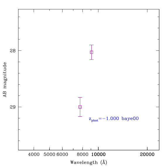 ![]() The figure at right shows the spectral energy distribution of the galaxy in question. It is plotted as AB magnitude vs. wavelength. Note that AB magnitude translates directly into flux per unit frequency, with the same conversion factor at all wavelengths. The points represent imaging data: Magenta points show the ACS optical data, the cyan points show the NICMOS IR data and black point show the ground based data, either from EIS or from ISAAC. The blue shows the best photometric redshift fit, as noted in the text on the figure. Below you can see thumbnail images of the object in all 15 bands (you may need to scroll to see all of them). Each thumbnail image is 64 pixels (=5.75'') on a side. The object selected should be near the centre of the image. Each thumbnail image is a clickable map. You can click on objects nearby the central object to bring up their pages. |