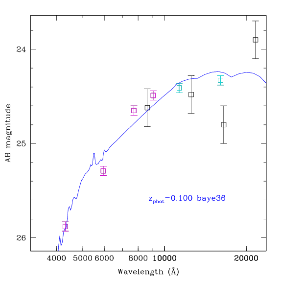 ![]() The figure at right shows the spectral energy distribution of the galaxy in question. It is plotted as AB magnitude vs. wavelength. Note that AB magnitude translates directly into flux per unit frequency, with the same conversion factor at all wavelengths. The points represent imaging data: Magenta points show the ACS optical data, the cyan points show the NICMOS IR data and black point show the ground based data, either from EIS or from ISAAC. The blue shows the best photometric redshift fit, as noted in the text on the figure. Below you can see thumbnail images of the object in all 15 bands (you may need to scroll to see all of them). Each thumbnail image is 64 pixels (=5.75'') on a side. The object selected should be near the centre of the image. Each thumbnail image is a clickable map. You can click on objects nearby the central object to bring up their pages. |