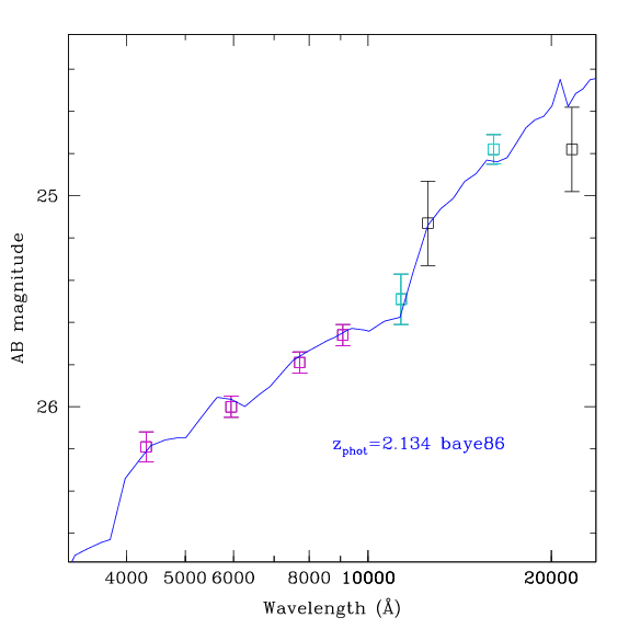 ![]() The figure at right shows the spectral energy distribution of the galaxy in question. It is plotted as AB magnitude vs. wavelength. Note that AB magnitude translates directly into flux per unit frequency, with the same conversion factor at all wavelengths. The points represent imaging data: Magenta points show the ACS optical data, the cyan points show the NICMOS IR data and black point show the ground based data, either from EIS or from ISAAC. The blue shows the best photometric redshift fit, as noted in the text on the figure. Below you can see thumbnail images of the object in all 15 bands (you may need to scroll to see all of them). Each thumbnail image is 64 pixels (=5.75'') on a side. The object selected should be near the centre of the image. Each thumbnail image is a clickable map. You can click on objects nearby the central object to bring up their pages. |
