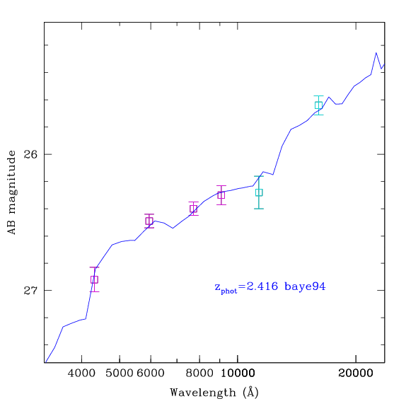 ![]() The figure at right shows the spectral energy distribution of the galaxy in question. It is plotted as AB magnitude vs. wavelength. Note that AB magnitude translates directly into flux per unit frequency, with the same conversion factor at all wavelengths. The points represent imaging data: Magenta points show the ACS optical data, the cyan points show the NICMOS IR data and black point show the ground based data, either from EIS or from ISAAC. The blue shows the best photometric redshift fit, as noted in the text on the figure. Below you can see thumbnail images of the object in all 15 bands (you may need to scroll to see all of them). Each thumbnail image is 64 pixels (=5.75'') on a side. The object selected should be near the centre of the image. Each thumbnail image is a clickable map. You can click on objects nearby the central object to bring up their pages. |