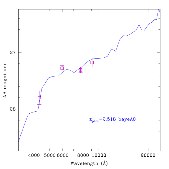 ![]() The figure at right shows the spectral energy distribution of the galaxy in question. It is plotted as AB magnitude vs. wavelength. Note that AB magnitude translates directly into flux per unit frequency, with the same conversion factor at all wavelengths. The points represent imaging data: Magenta points show the ACS optical data, the cyan points show the NICMOS IR data and black point show the ground based data, either from EIS or from ISAAC. The blue shows the best photometric redshift fit, as noted in the text on the figure. Below you can see thumbnail images of the object in all 15 bands (you may need to scroll to see all of them). Each thumbnail image is 64 pixels (=5.75'') on a side. The object selected should be near the centre of the image. Each thumbnail image is a clickable map. You can click on objects nearby the central object to bring up their pages. |