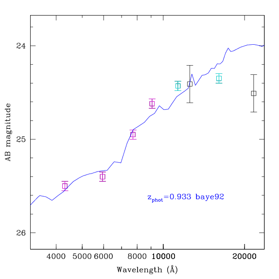 ![]() The figure at right shows the spectral energy distribution of the galaxy in question. It is plotted as AB magnitude vs. wavelength. Note that AB magnitude translates directly into flux per unit frequency, with the same conversion factor at all wavelengths. The points represent imaging data: Magenta points show the ACS optical data, the cyan points show the NICMOS IR data and black point show the ground based data, either from EIS or from ISAAC. The blue shows the best photometric redshift fit, as noted in the text on the figure. Below you can see thumbnail images of the object in all 15 bands (you may need to scroll to see all of them). Each thumbnail image is 64 pixels (=5.75'') on a side. The object selected should be near the centre of the image. Each thumbnail image is a clickable map. You can click on objects nearby the central object to bring up their pages. |
