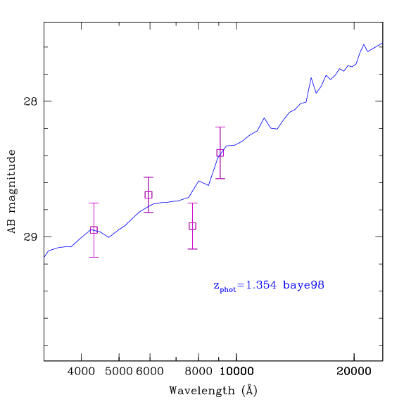 ![]() The figure at right shows the spectral energy distribution of the galaxy in question. It is plotted as AB magnitude vs. wavelength. Note that AB magnitude translates directly into flux per unit frequency, with the same conversion factor at all wavelengths. The points represent imaging data: Magenta points show the ACS optical data, the cyan points show the NICMOS IR data and black point show the ground based data, either from EIS or from ISAAC. The blue shows the best photometric redshift fit, as noted in the text on the figure. Below you can see thumbnail images of the object in all 15 bands (you may need to scroll to see all of them). Each thumbnail image is 64 pixels (=5.75'') on a side. The object selected should be near the centre of the image. Each thumbnail image is a clickable map. You can click on objects nearby the central object to bring up their pages. |