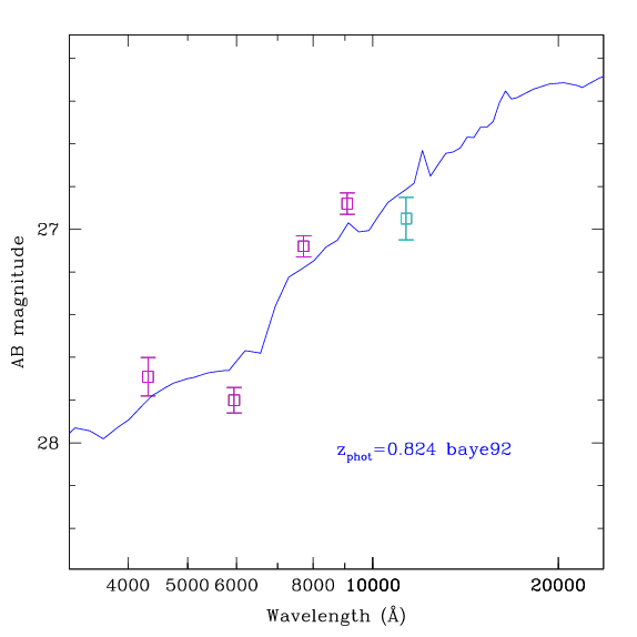 ![]() The figure at right shows the spectral energy distribution of the galaxy in question. It is plotted as AB magnitude vs. wavelength. Note that AB magnitude translates directly into flux per unit frequency, with the same conversion factor at all wavelengths. The points represent imaging data: Magenta points show the ACS optical data, the cyan points show the NICMOS IR data and black point show the ground based data, either from EIS or from ISAAC. The blue shows the best photometric redshift fit, as noted in the text on the figure. Below you can see thumbnail images of the object in all 15 bands (you may need to scroll to see all of them). Each thumbnail image is 64 pixels (=5.75'') on a side. The object selected should be near the centre of the image. Each thumbnail image is a clickable map. You can click on objects nearby the central object to bring up their pages. |