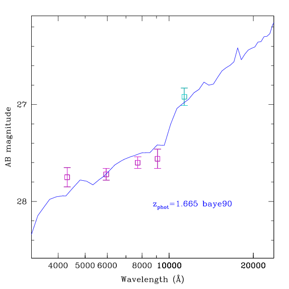 ![]() The figure at right shows the spectral energy distribution of the galaxy in question. It is plotted as AB magnitude vs. wavelength. Note that AB magnitude translates directly into flux per unit frequency, with the same conversion factor at all wavelengths. The points represent imaging data: Magenta points show the ACS optical data, the cyan points show the NICMOS IR data and black point show the ground based data, either from EIS or from ISAAC. The blue shows the best photometric redshift fit, as noted in the text on the figure. Below you can see thumbnail images of the object in all 15 bands (you may need to scroll to see all of them). Each thumbnail image is 64 pixels (=5.75'') on a side. The object selected should be near the centre of the image. Each thumbnail image is a clickable map. You can click on objects nearby the central object to bring up their pages. |