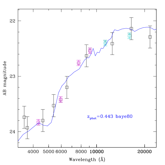 ![]() The figure at right shows the spectral energy distribution of the galaxy in question. It is plotted as AB magnitude vs. wavelength. Note that AB magnitude translates directly into flux per unit frequency, with the same conversion factor at all wavelengths. The points represent imaging data: Magenta points show the ACS optical data, the cyan points show the NICMOS IR data and black point show the ground based data, either from EIS or from ISAAC. The blue shows the best photometric redshift fit, as noted in the text on the figure. Below you can see thumbnail images of the object in all 15 bands (you may need to scroll to see all of them). Each thumbnail image is 64 pixels (=5.75'') on a side. The object selected should be near the centre of the image. Each thumbnail image is a clickable map. You can click on objects nearby the central object to bring up their pages. |