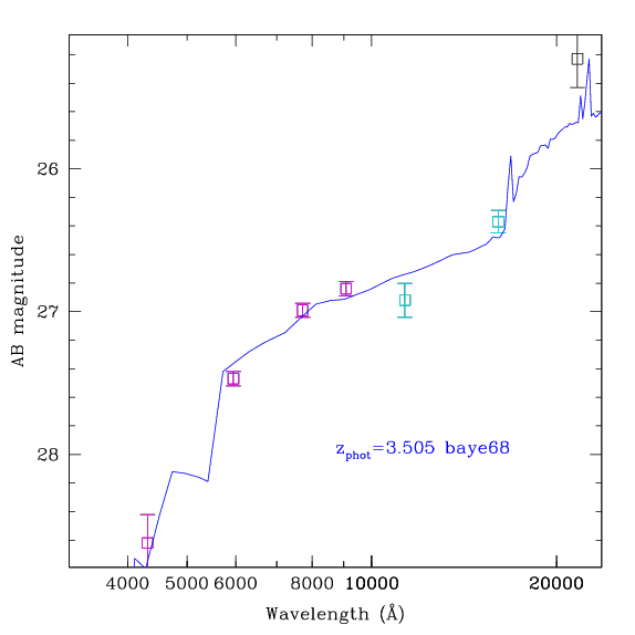 ![]() The figure at right shows the spectral energy distribution of the galaxy in question. It is plotted as AB magnitude vs. wavelength. Note that AB magnitude translates directly into flux per unit frequency, with the same conversion factor at all wavelengths. The points represent imaging data: Magenta points show the ACS optical data, the cyan points show the NICMOS IR data and black point show the ground based data, either from EIS or from ISAAC. The blue shows the best photometric redshift fit, as noted in the text on the figure. Below you can see thumbnail images of the object in all 15 bands (you may need to scroll to see all of them). Each thumbnail image is 64 pixels (=5.75'') on a side. The object selected should be near the centre of the image. Each thumbnail image is a clickable map. You can click on objects nearby the central object to bring up their pages. |