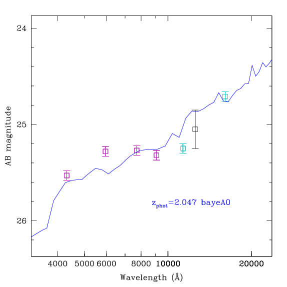 ![]() The figure at right shows the spectral energy distribution of the galaxy in question. It is plotted as AB magnitude vs. wavelength. Note that AB magnitude translates directly into flux per unit frequency, with the same conversion factor at all wavelengths. The points represent imaging data: Magenta points show the ACS optical data, the cyan points show the NICMOS IR data and black point show the ground based data, either from EIS or from ISAAC. The blue shows the best photometric redshift fit, as noted in the text on the figure. Below you can see thumbnail images of the object in all 15 bands (you may need to scroll to see all of them). Each thumbnail image is 64 pixels (=5.75'') on a side. The object selected should be near the centre of the image. Each thumbnail image is a clickable map. You can click on objects nearby the central object to bring up their pages. |