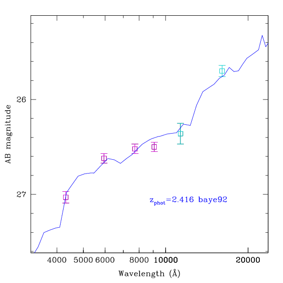 ![]() The figure at right shows the spectral energy distribution of the galaxy in question. It is plotted as AB magnitude vs. wavelength. Note that AB magnitude translates directly into flux per unit frequency, with the same conversion factor at all wavelengths. The points represent imaging data: Magenta points show the ACS optical data, the cyan points show the NICMOS IR data and black point show the ground based data, either from EIS or from ISAAC. The blue shows the best photometric redshift fit, as noted in the text on the figure. Below you can see thumbnail images of the object in all 15 bands (you may need to scroll to see all of them). Each thumbnail image is 64 pixels (=5.75'') on a side. The object selected should be near the centre of the image. Each thumbnail image is a clickable map. You can click on objects nearby the central object to bring up their pages. |