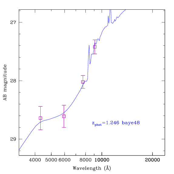 ![]() The figure at right shows the spectral energy distribution of the galaxy in question. It is plotted as AB magnitude vs. wavelength. Note that AB magnitude translates directly into flux per unit frequency, with the same conversion factor at all wavelengths. The points represent imaging data: Magenta points show the ACS optical data, the cyan points show the NICMOS IR data and black point show the ground based data, either from EIS or from ISAAC. The blue shows the best photometric redshift fit, as noted in the text on the figure. Below you can see thumbnail images of the object in all 15 bands (you may need to scroll to see all of them). Each thumbnail image is 64 pixels (=5.75'') on a side. The object selected should be near the centre of the image. Each thumbnail image is a clickable map. You can click on objects nearby the central object to bring up their pages. |
