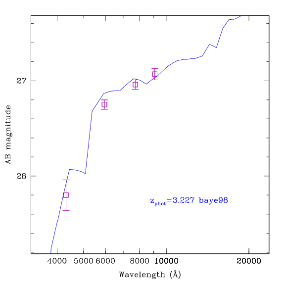 ![]() The figure at right shows the spectral energy distribution of the galaxy in question. It is plotted as AB magnitude vs. wavelength. Note that AB magnitude translates directly into flux per unit frequency, with the same conversion factor at all wavelengths. The points represent imaging data: Magenta points show the ACS optical data, the cyan points show the NICMOS IR data and black point show the ground based data, either from EIS or from ISAAC. The blue shows the best photometric redshift fit, as noted in the text on the figure. Below you can see thumbnail images of the object in all 15 bands (you may need to scroll to see all of them). Each thumbnail image is 64 pixels (=5.75'') on a side. The object selected should be near the centre of the image. Each thumbnail image is a clickable map. You can click on objects nearby the central object to bring up their pages. |