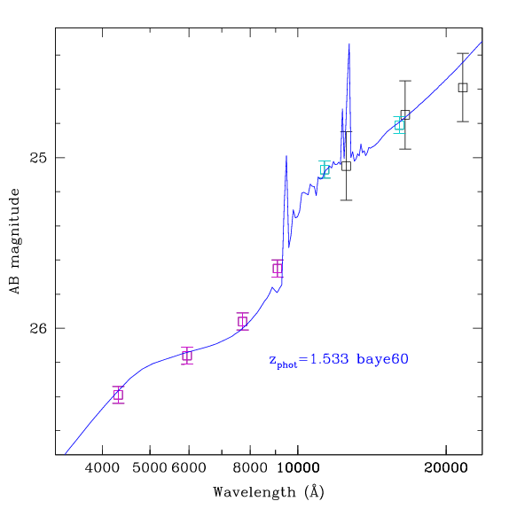 ![]() The figure at right shows the spectral energy distribution of the galaxy in question. It is plotted as AB magnitude vs. wavelength. Note that AB magnitude translates directly into flux per unit frequency, with the same conversion factor at all wavelengths. The points represent imaging data: Magenta points show the ACS optical data, the cyan points show the NICMOS IR data and black point show the ground based data, either from EIS or from ISAAC. The blue shows the best photometric redshift fit, as noted in the text on the figure. Below you can see thumbnail images of the object in all 15 bands (you may need to scroll to see all of them). Each thumbnail image is 64 pixels (=5.75'') on a side. The object selected should be near the centre of the image. Each thumbnail image is a clickable map. You can click on objects nearby the central object to bring up their pages. |