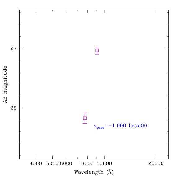 ![]() The figure at right shows the spectral energy distribution of the galaxy in question. It is plotted as AB magnitude vs. wavelength. Note that AB magnitude translates directly into flux per unit frequency, with the same conversion factor at all wavelengths. The points represent imaging data: Magenta points show the ACS optical data, the cyan points show the NICMOS IR data and black point show the ground based data, either from EIS or from ISAAC. The blue shows the best photometric redshift fit, as noted in the text on the figure. Below you can see thumbnail images of the object in all 15 bands (you may need to scroll to see all of them). Each thumbnail image is 64 pixels (=5.75'') on a side. The object selected should be near the centre of the image. Each thumbnail image is a clickable map. You can click on objects nearby the central object to bring up their pages. |