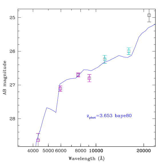 ![]() The figure at right shows the spectral energy distribution of the galaxy in question. It is plotted as AB magnitude vs. wavelength. Note that AB magnitude translates directly into flux per unit frequency, with the same conversion factor at all wavelengths. The points represent imaging data: Magenta points show the ACS optical data, the cyan points show the NICMOS IR data and black point show the ground based data, either from EIS or from ISAAC. The blue shows the best photometric redshift fit, as noted in the text on the figure. Below you can see thumbnail images of the object in all 15 bands (you may need to scroll to see all of them). Each thumbnail image is 64 pixels (=5.75'') on a side. The object selected should be near the centre of the image. Each thumbnail image is a clickable map. You can click on objects nearby the central object to bring up their pages. |