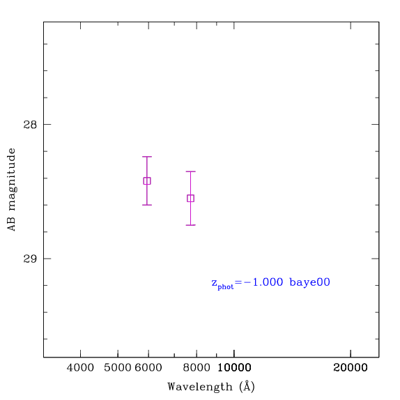 ![]() The figure at right shows the spectral energy distribution of the galaxy in question. It is plotted as AB magnitude vs. wavelength. Note that AB magnitude translates directly into flux per unit frequency, with the same conversion factor at all wavelengths. The points represent imaging data: Magenta points show the ACS optical data, the cyan points show the NICMOS IR data and black point show the ground based data, either from EIS or from ISAAC. The blue shows the best photometric redshift fit, as noted in the text on the figure. Below you can see thumbnail images of the object in all 15 bands (you may need to scroll to see all of them). Each thumbnail image is 64 pixels (=5.75'') on a side. The object selected should be near the centre of the image. Each thumbnail image is a clickable map. You can click on objects nearby the central object to bring up their pages. |