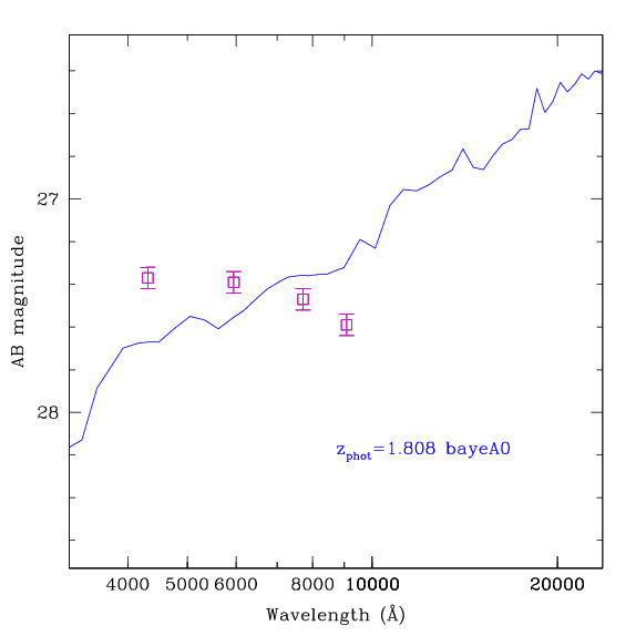 ![]() The figure at right shows the spectral energy distribution of the galaxy in question. It is plotted as AB magnitude vs. wavelength. Note that AB magnitude translates directly into flux per unit frequency, with the same conversion factor at all wavelengths. The points represent imaging data: Magenta points show the ACS optical data, the cyan points show the NICMOS IR data and black point show the ground based data, either from EIS or from ISAAC. The blue shows the best photometric redshift fit, as noted in the text on the figure. Below you can see thumbnail images of the object in all 15 bands (you may need to scroll to see all of them). Each thumbnail image is 64 pixels (=5.75'') on a side. The object selected should be near the centre of the image. Each thumbnail image is a clickable map. You can click on objects nearby the central object to bring up their pages. |