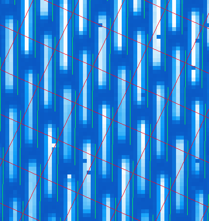 A sample of the 2D image with the computed wavelength calibration is given below. In order to see how your wavelength solution compares with the data, one can open an image (e.g. S20131208S0150.fits) in GPItv (this is done either from the GPI Launcher or from just double clicking on the file name in the Recipe Editor). The user then selects their wavecal by selecting “Labels”->Select Wavecal/Polcal file, then selecting the desired wavelength calibration from the list. The user then selects “Labels” -> Plot Wavcal/Polcal Grid. The green lines are the locations of the individual lenslet spectra. The coordinates of the lenslets are stored in a .fits file cube in the calibrations folder.