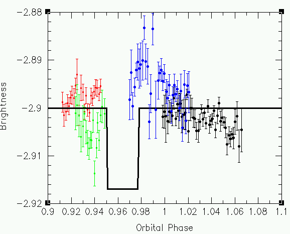 the brightness of HD68988 relative to a nearby star is plotted as dots.